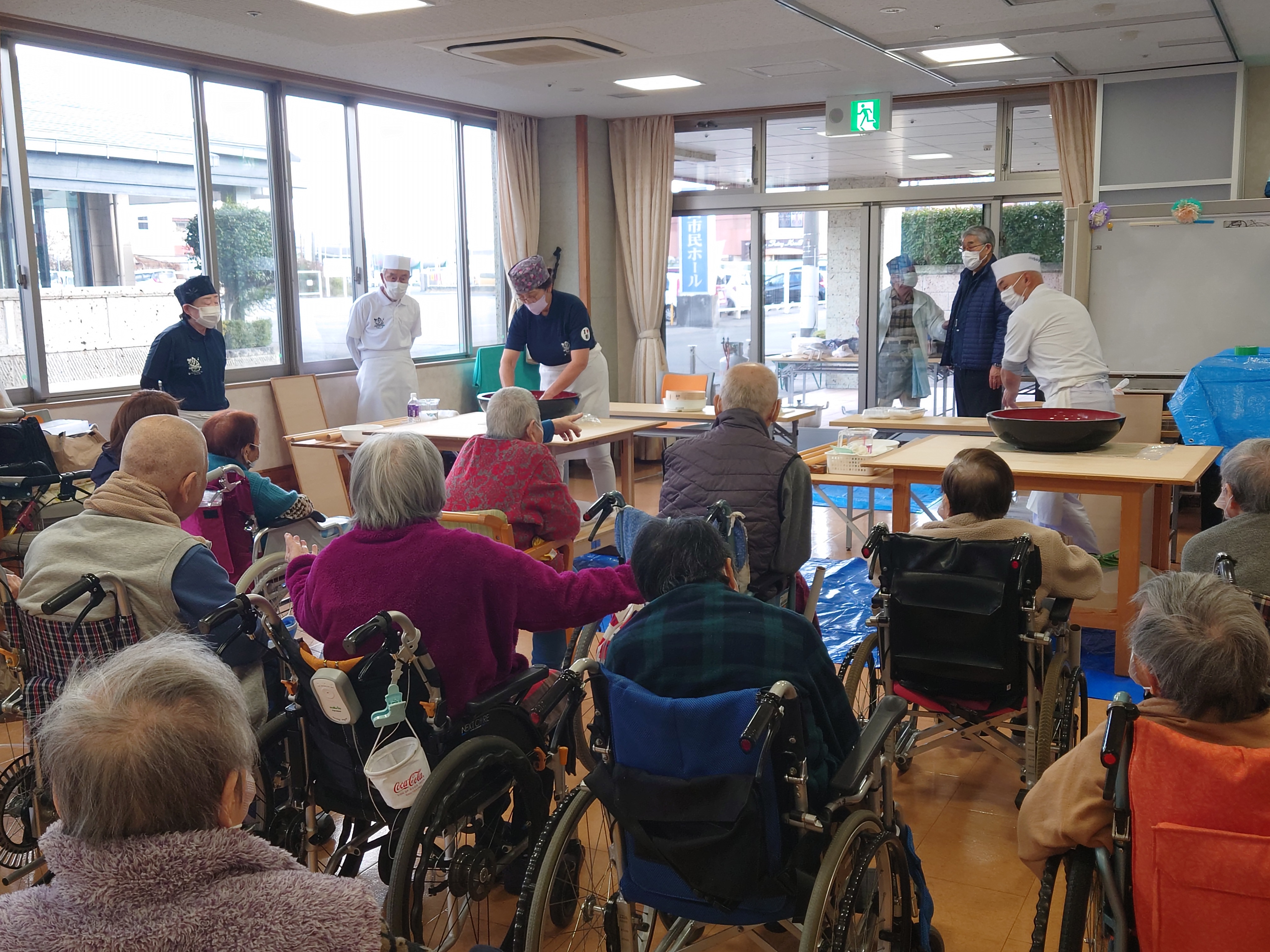 「そば打ちは初めて見る」とおっしゃる入居者様もいて、みなさん食い入るように見入っていました。